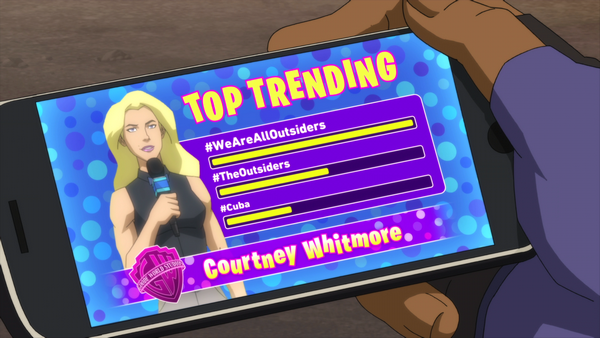 Eduardo explains that the people at the Center need to see someone with the Outsiders that they know, personally. Beast Boy is convinced and asks for a vote. The Outsiders agree, unanimously. Wendy Jones approaches Eduardo Jr. saying that she overheard and is super excited that he is joining the Outsiders. She tells everyone to check their phones as Courtney Whitmore is covering the Outsiders mission in Cuba, explaining that the team is now more popular than ever. Even more than the Justice League. The group all stare at each other, flabbergasted about that last comment.