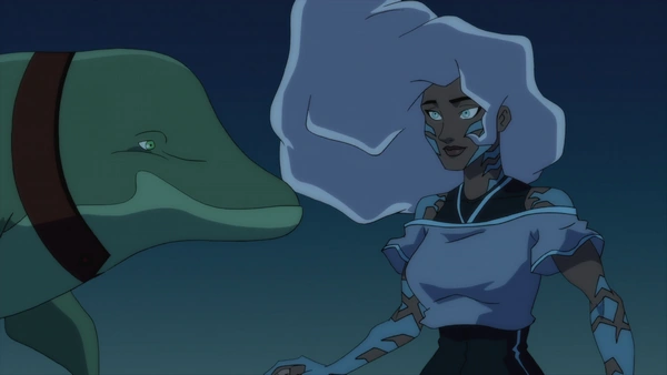 Bio-Ship lowers a ramp and allows the new meta-human refugees off. Aquaman congratulates Beast Boy, who informs him that there is one more and she is a special case. The Bio-Ship shows Aquaman the hold where the girl with gills is drifting in a special container of water. Aquaman says that they will make alternate arrangements for her since the Center isn't built for water-breathers.