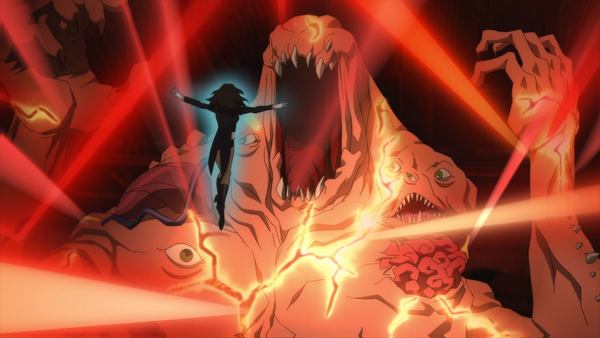 Static rips a hole in the building as he enters with Beast Boy and Wonder Girl. Klarion calls upon his creature to attack. Forms of teenagers trying to escape the gigantic flesh monster protrude from its skin. The monster attacks. Beast Boy orders Wonder Girl and Static to take care of the monster without hurting it while he goes after Klarion.