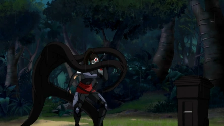 Katana and Metamorpho make their way through the jungle in Santa Prisca, with Metamorpho using his ability to transform into solids, liquids and gases to allow them to slip past several members of the League of Shadows.