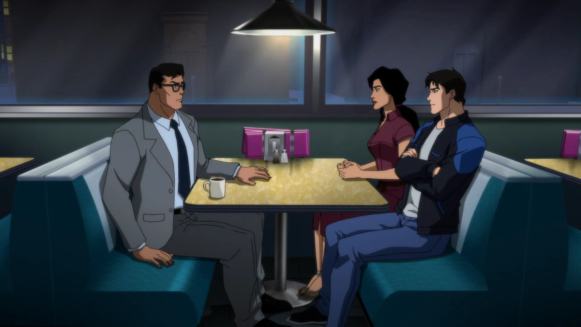 Clark Kent sips coffee at Bibbo's Diner, when Dick and Zatanna sit either side of him and ask for Superman's help, to his exasperation.