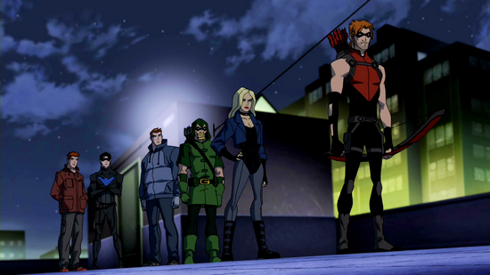 Roy shoots his zipline, but his landing on the rooftop is far from perfect. He stumbles and falls, and lands at Green Arrow's feet. He refuses help, but then sees his mentor is not alone: Nightwing, Jim Harper, Black Canary and Wally West are also there.