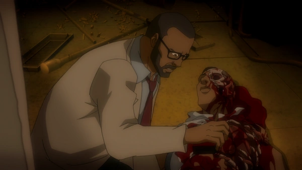 Silas is a dark-skinned middle-aged man with brown eyes, a beard, and black hair cut at the bottom. He normally sports rectangular glasses and a communicator at his ear, and wears a white lab coat with a grayish-blue shirt and maroon tie.