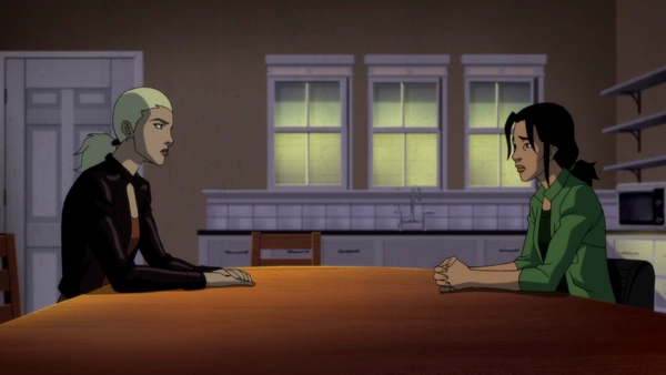 Back at the University Library, the mysterious woman introduces herself as Onyx Adams and explains that she thought Arsenal and Arrowette were working for the League of Shadows. She also claims that she wasn't following Tigress to attack her, but to warn her: Cassandra Savage is on her way to claim that she has defected from the League and needs Tigress's help. But her true intention is to become a mole on the Team. At that moment, Cassandra comes out of the shadows. She has scars on her face and has also lost an arm. Cassandra claims that the League must have sent Onyx to sabotage her reception with Tigress. She explains that she was once loyal to her father, but after Vandal killed her sister, Olympia Savage, she couldn't stand it much longer. She tried to escape, once before, which cost her face and her arm. Onyx accuses Cassandra of lying. Not knowing which one to trust, Tigress decides that there is only one thing to do.