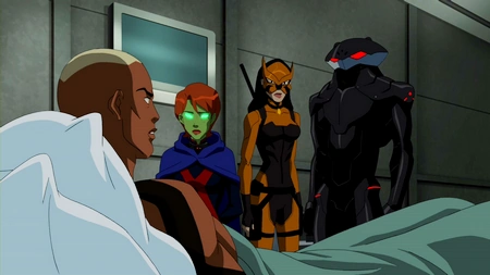 Tigress's thoughts are interrupted as Black Manta puts a hand on her shoulder. He says it has been six hours since Miss Martian started the process. Miss Martian stops the process long enough to tell Manta it could take some time for her to finish. Manta accuses Miss Martian of stalling, but then Kaldur recognizes his father, thus Manta realizes Miss Martian is making progress. He asks to speak privately with Tigress, and when they leave Kaldur's quarters, Manta tells Tigress he plans to kill Miss Martian after she has finished restoring Kaldur's mind.