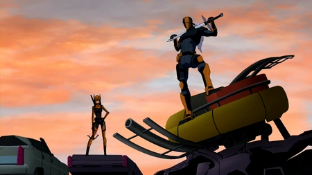 - When Deathstroke is revealed, his sword appears to be unsheathed (or mis-colored in white). But on the next frame, the blade is in its sheath (or colored as such).