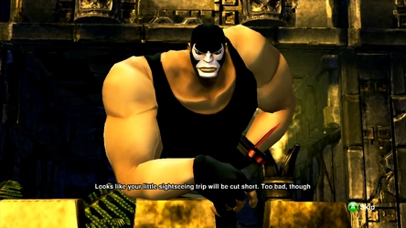 As the squad fight their way toward the shrine, Red Tornado calls—he has detected another transmission from Dr. Sandsmark nearby. As they move on, Alpha is able to successfully download the transmission, and then locates another signal. As Alpha nears the temple, they pass the hanging statues of Santa Prisca, cross networks of circular platforms via rotating bridges moved by turning levers on the platforms and download another transmission from Helena.