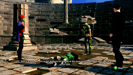 Inside, they discover the temple has a multitude of paths, and they don't have the time to explore both. Aqualad calls in Nightwing, who will lead Beta Squad through the secondary path. Alpha battles its way past undead soldiers and LexCorp robots until they come to a hall of statues. While one unlocks the door by pushing a lion statue towards a warrior statue, the others see large hammer-wielding statues come to life. They defeat nine statues in all before the door opens.