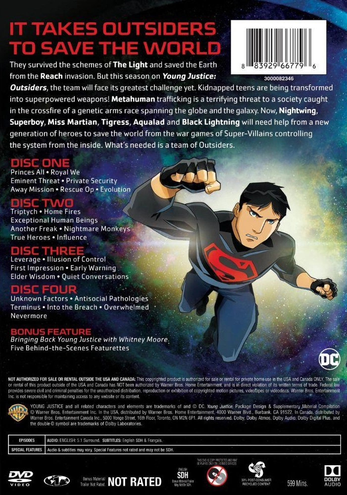 Young Justice: Outsiders – The Complete Third Season is the name of the DVD and Blu-ray release that contains the complete season three of Young Justice. Both sets were released on November 26, 2019.